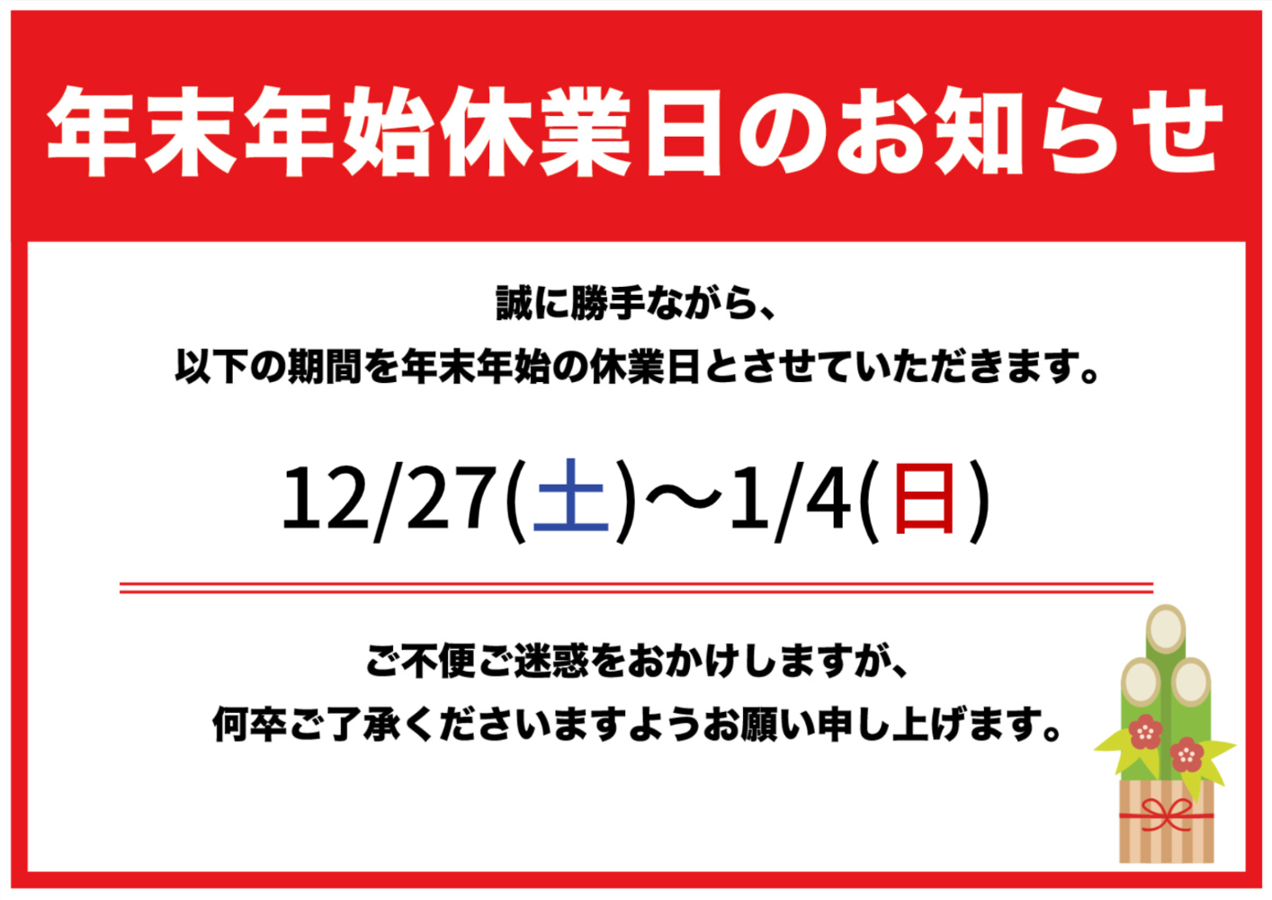 年末年始休業のご案内